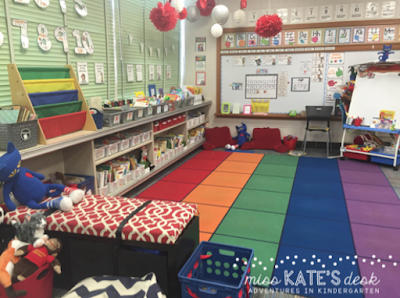 Students find a book and read in this big carpet area. They can read on the bench, on those red back pillows, or sprawl out on the floor. We practice the week we learn procedures our reading stamina as a class. I start a timer and when someone isn't reading or starts talking we start over. They love doing this and trying to get a higher time. It helps in the long run with practicing reading the pictures, reading words (if we can this early on), or telling a story (in our heads of course). The beginning of the year our rounds are about 6-8 mins each and gradually work up to about 15 mins each. This helps build stamina too!